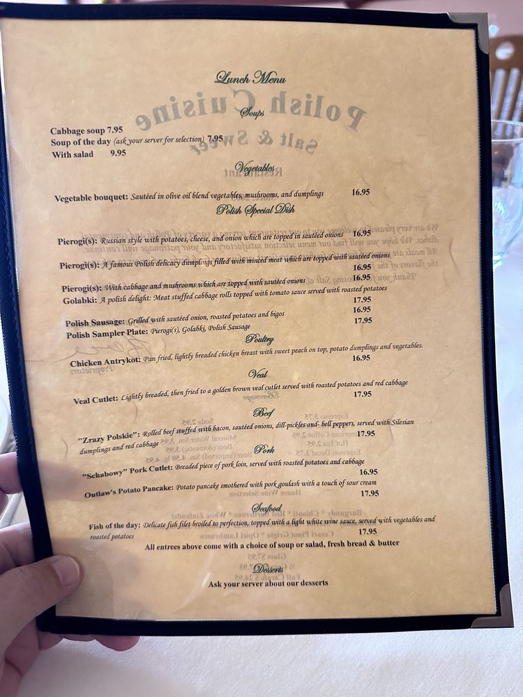 “ Oh, how lucky we are to have such a gem in this town! From the second you walk in, you are transported to another country with knickknacks, candles galore and white table cloths. It feels like you are visiting your Polish grans house that just wants to feed to you a delicious meal. And you're in luck! Cause a delicious meal is what's for dinner. The service is top notch! The wait staff is seasoned, kind, professional and helpful. I love seeing the same faces over the years and the food never disappoints. I'm not a beer drinker, and yet, I always go for the Lomza! It just feels right and pairs perfectly with every dish they offer. Warm bread and butter to start. Soft and delicious. A bowl of hardly cabbage soup is always what I get. I can't get enough of it! The sausage is just to die for! Perfectly grilled, with delicious cabbage and meat Bigos (stew) underneath. And the potatoes are out of this world! Crispy outside and the most creamy inside. The lamb shank was tender as could be with so much flavor. And of course, more of those famous potatoes! From the moment you walk in, to the moment you leave, you feel like family. Salt and Sweet is an affordable fine dining experience you must try!!! ”